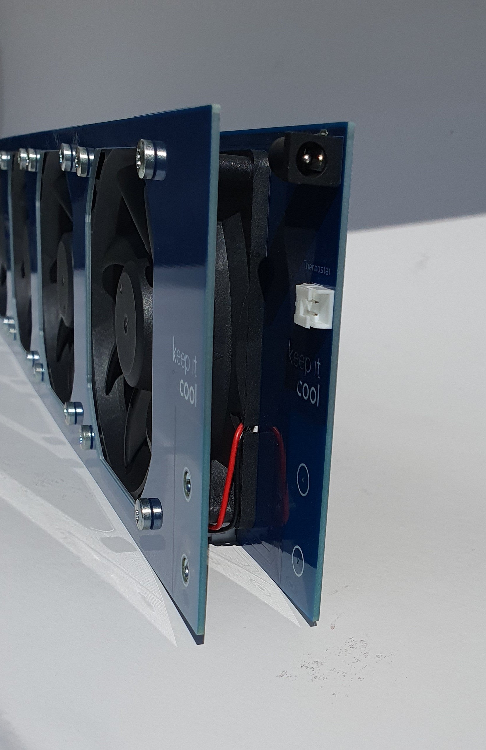 Mittels Thermostat (35°C/40°C) werden bei Erreichen der Temperatur alle Lüfter ein- bzw. ausgeschaltet.